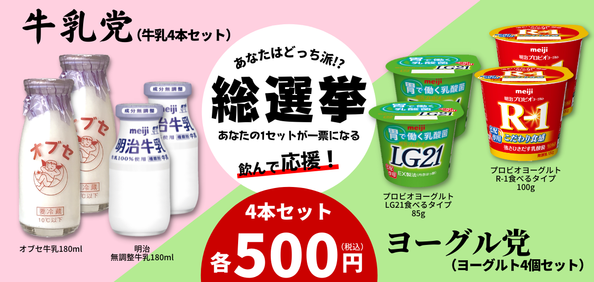【牛乳党セット】、【ヨーグル党セット】をそれぞれご購入いただくことで投票とします。