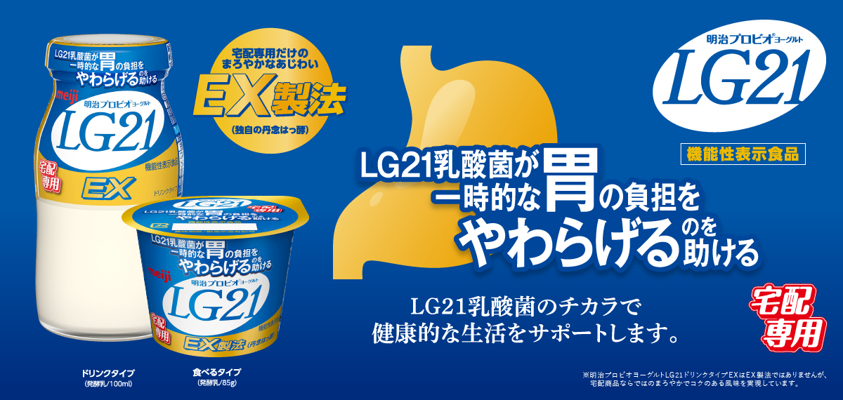 「明治プロビオヨーグルトLG21」は、2000年3月の発売以来、ヨーグルトの新たな健康価値を創造し、多くの人から好評を得ているロングセラーブランド。使用している“LG21乳酸菌”は明治独自の乳酸菌研究の中で、胃に着目して選び抜いた特別な乳酸菌となっています。酸に対する耐性が高く、強い酸性条件下である胃でも生存して増殖することが可能であり、さらに胃細胞への付着性が高いという、胃内環境で個性的な特長を持っているヨーグルトです。